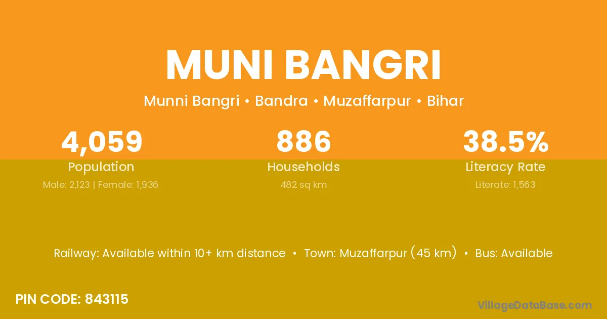 Muzaffarpur (45 km) is the nearest town to Muni Bangri village for major economic activities and is located approximately 45 km away.