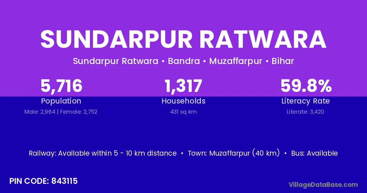 Muzaffarpur (40 km) is the nearest town to Sundarpur Ratwara village for major economic activities and is located approximately 40 km away.
