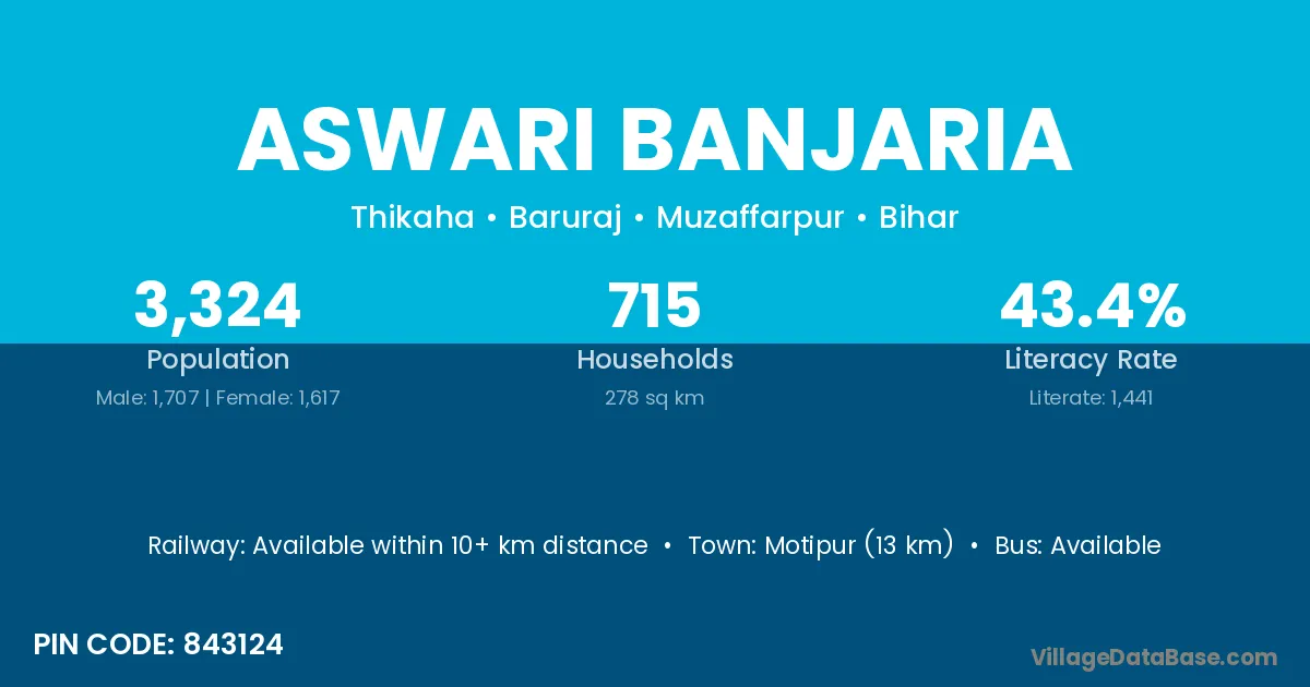 Motipur (13 km) is the nearest town to Aswari Banjaria village for major economic activities and is located approximately 13 km away.