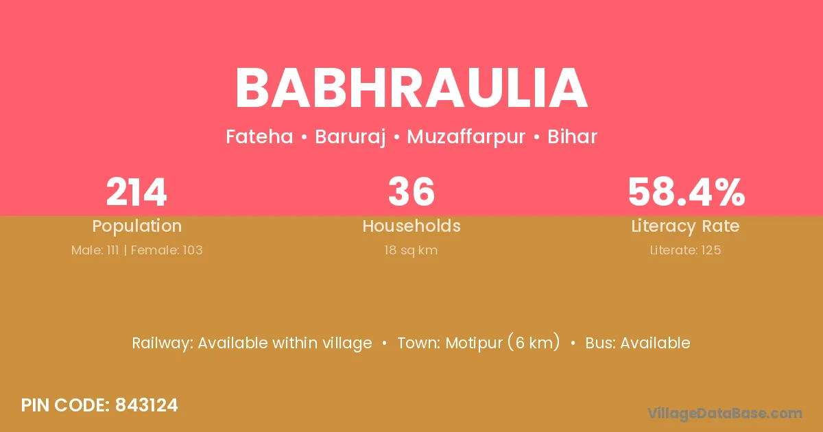Motipur (6 km) is the nearest town to Babhraulia village for major economic activities and is located approximately 6 km away.
