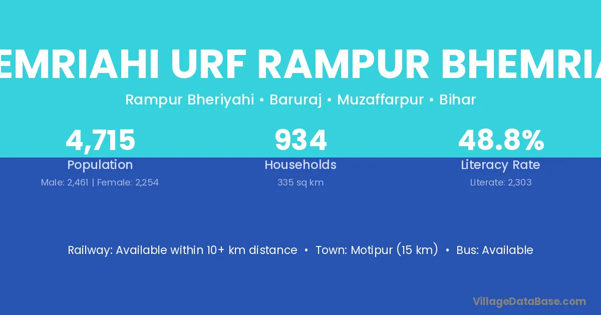Motipur (15 km) is the nearest town to Bhemriahi Urf Rampur Bhemriahi village for major economic activities and is located approximately 15 km away.