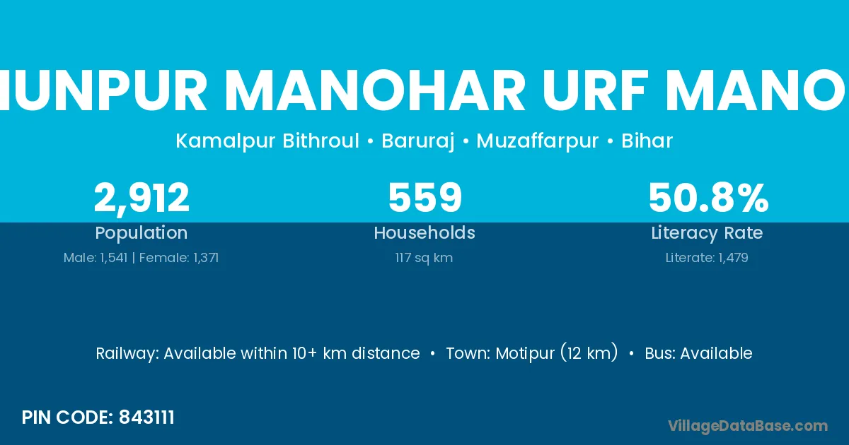 Motipur (12 km) is the nearest town to Bishunpur Manohar Urf Manohar village for major economic activities and is located approximately 12 km away.