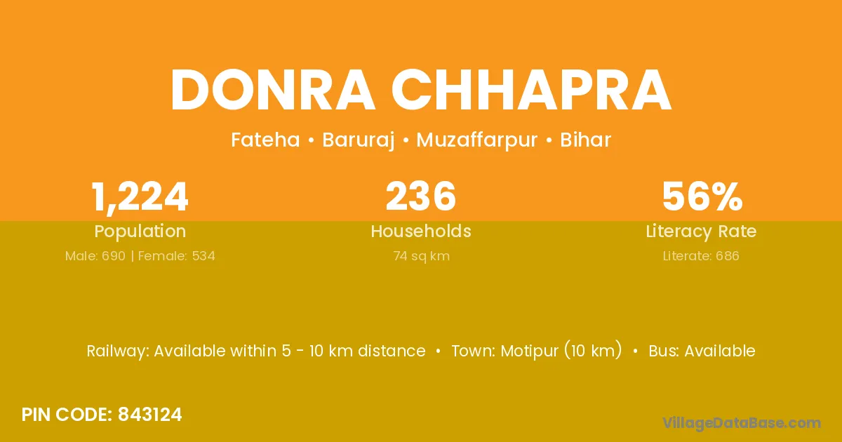 Motipur (10 km) is the nearest town to Donra Chhapra village for major economic activities and is located approximately 10 km away.