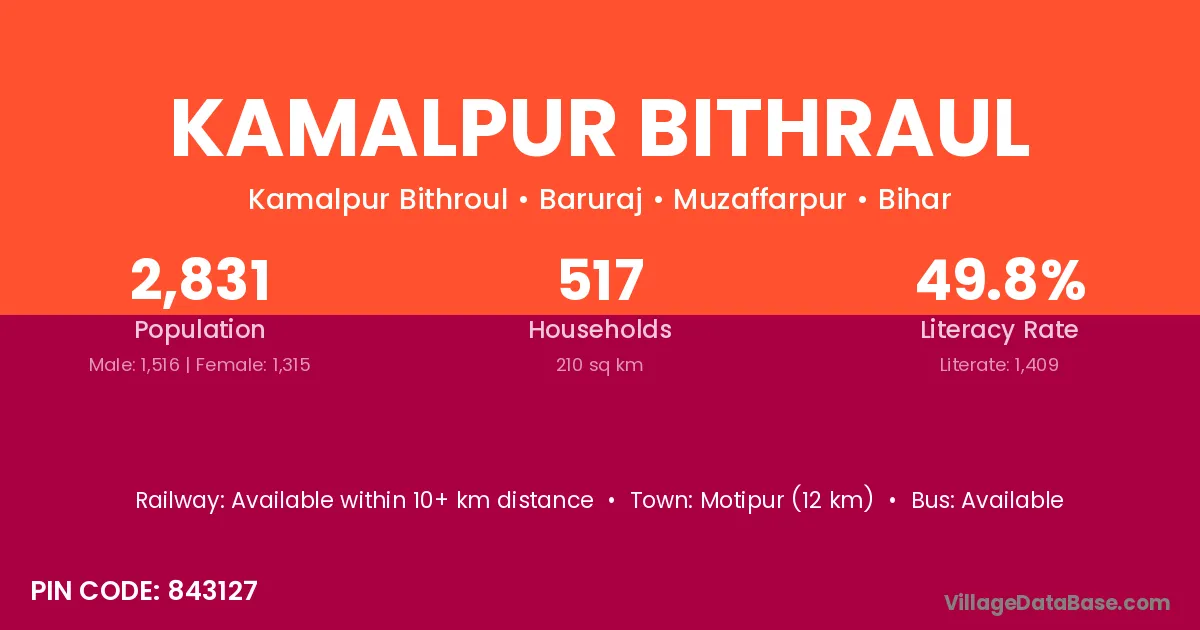 Kamalpur Bithraul village has a total population of 2,831 people, of which 1,516 are males and 1,315 are females.