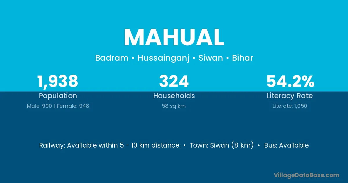 Motipur (7 km) is the nearest town to Mahual village for major economic activities and is located approximately 7 km away.