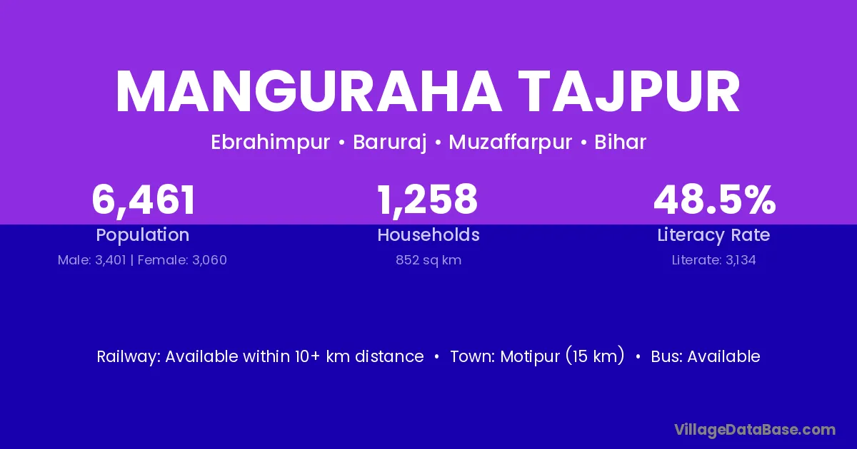 Motipur (15 km) is the nearest town to Manguraha Tajpur village for major economic activities and is located approximately 15 km away.