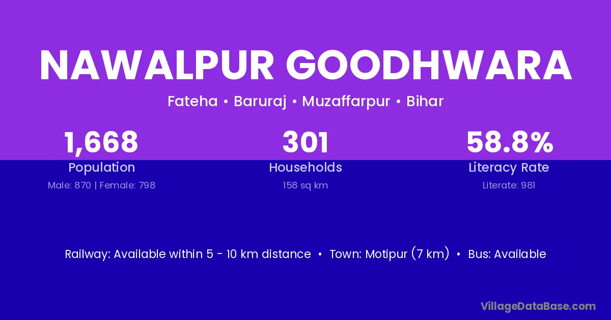Motipur (7 km) is the nearest town to Nawalpur Goodhwara village for major economic activities and is located approximately 7 km away.
