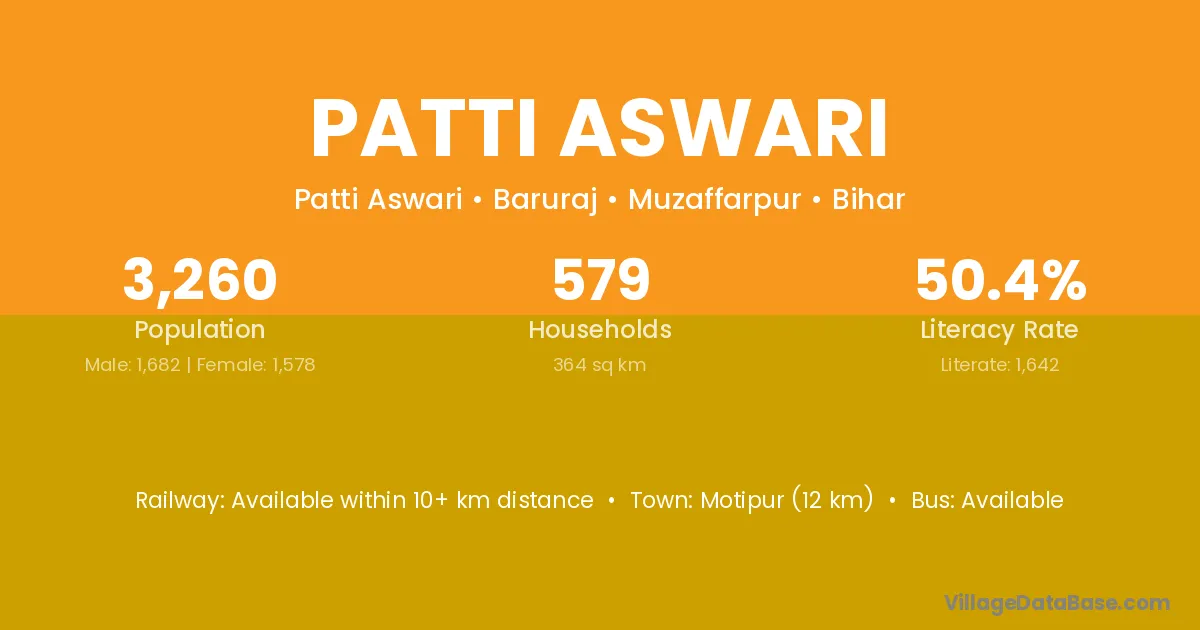 Motipur (12 km) is the nearest town to Patti Aswari village for major economic activities and is located approximately 12 km away.