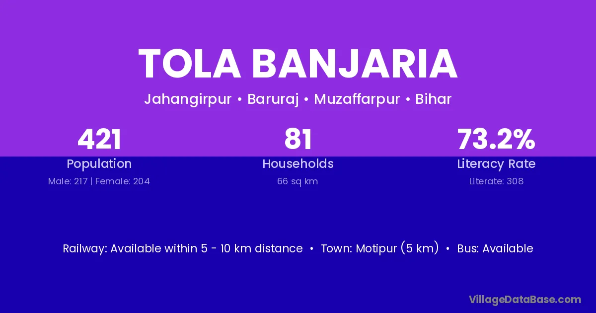 Motipur (5 km) is the nearest town to Tola Banjaria village for major economic activities and is located approximately 5 km away.