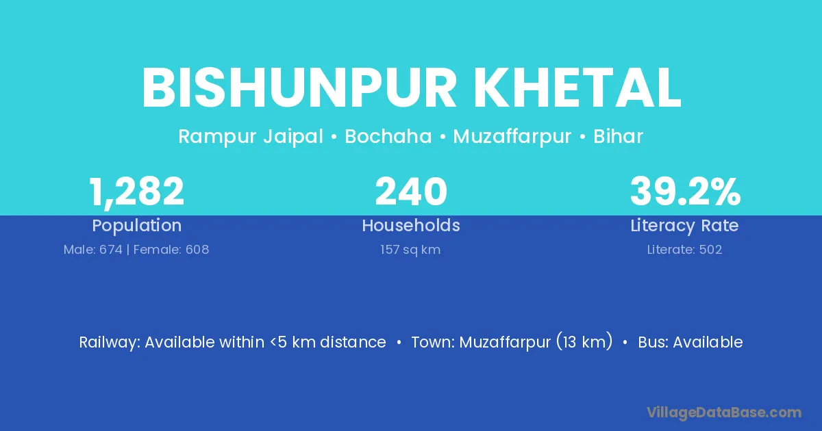 Bishunpur Khetal village has a total population of 1,282 people, of which 674 are males and 608 are females.