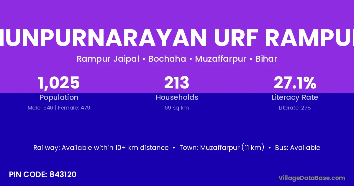 Bishunpurnarayan Urf Rampursir village has a total population of 1,025 people, of which 546 are males and 479 are females.