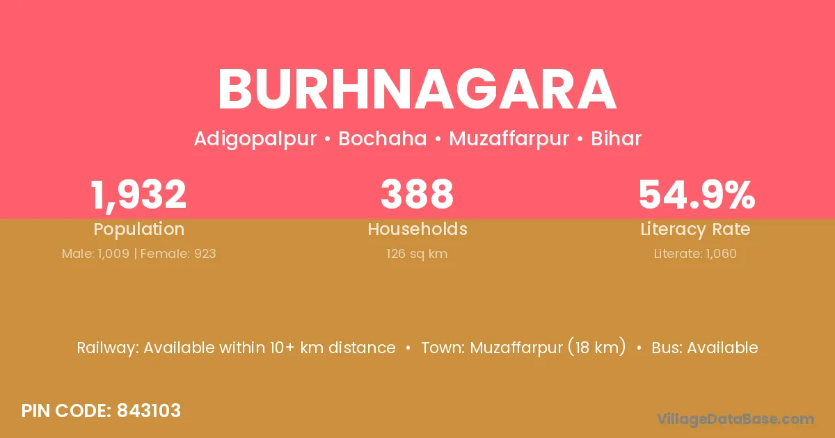 Muzaffarpur (18 km) is the nearest town to Burhnagara village for major economic activities and is located approximately 18 km away.