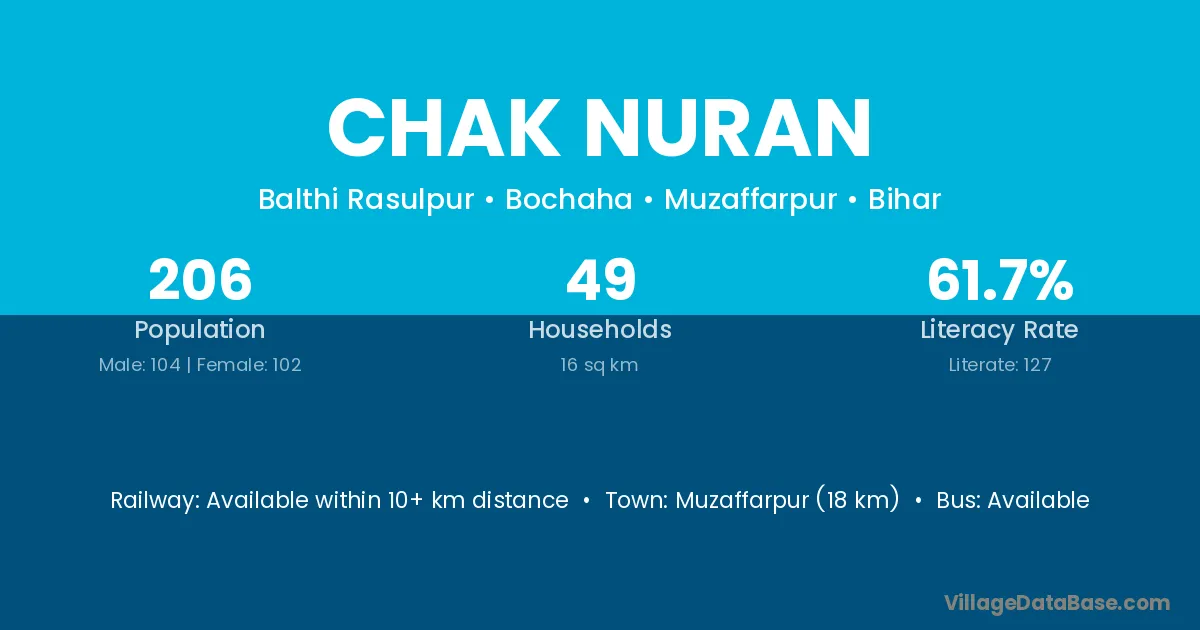 Muzaffarpur (18 km) is the nearest town to Chak Nuran village for major economic activities and is located approximately 18 km away.