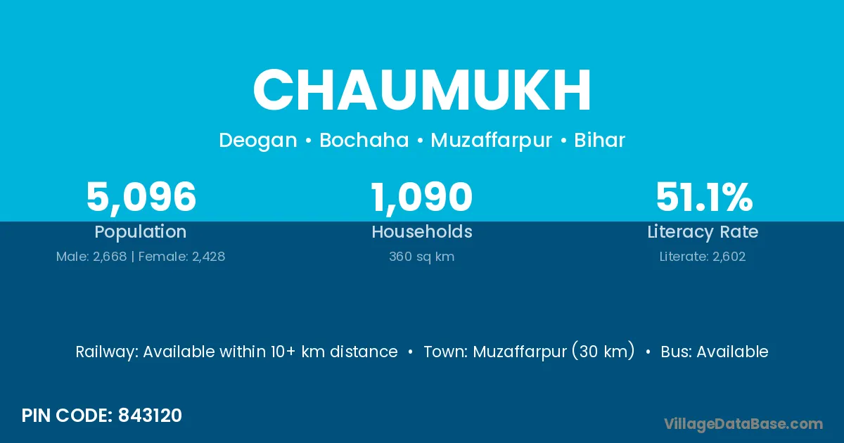 Muzaffarpur (30 km) is the nearest town to Chaumukh village for major economic activities and is located approximately 30 km away.