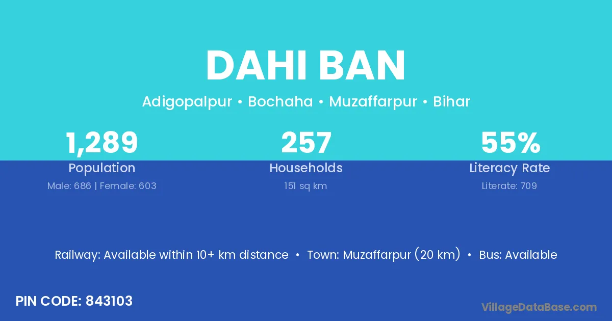 Muzaffarpur (20 km) is the nearest town to Dahi Ban village for major economic activities and is located approximately 20 km away.