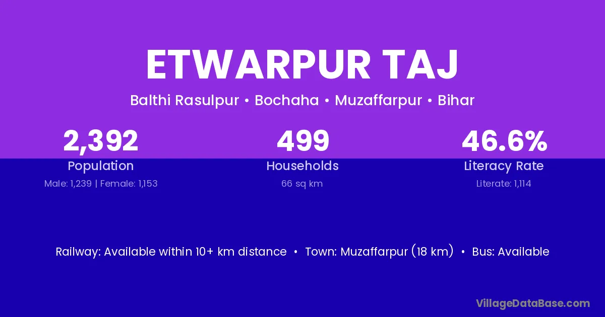 Muzaffarpur (18 km) is the nearest town to Etwarpur Taj village for major economic activities and is located approximately 18 km away.