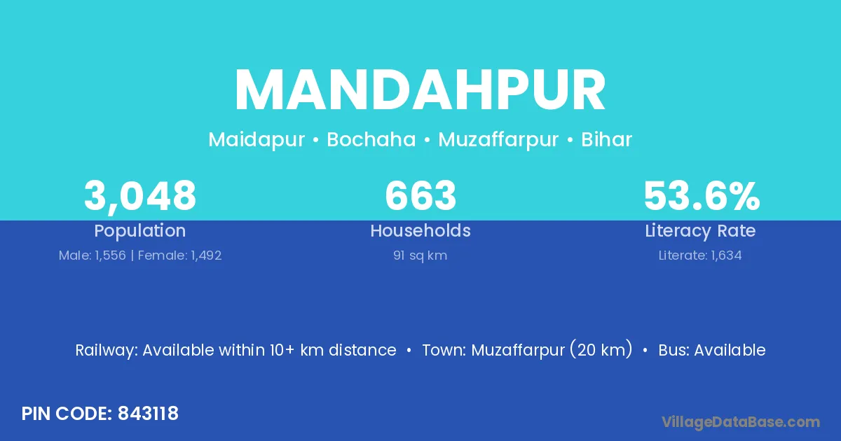 Muzaffarpur (20 km) is the nearest town to Mandahpur village for major economic activities and is located approximately 20 km away.