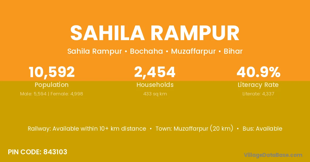 Muzaffarpur (20 km) is the nearest town to Sahila Rampur village for major economic activities and is located approximately 20 km away.