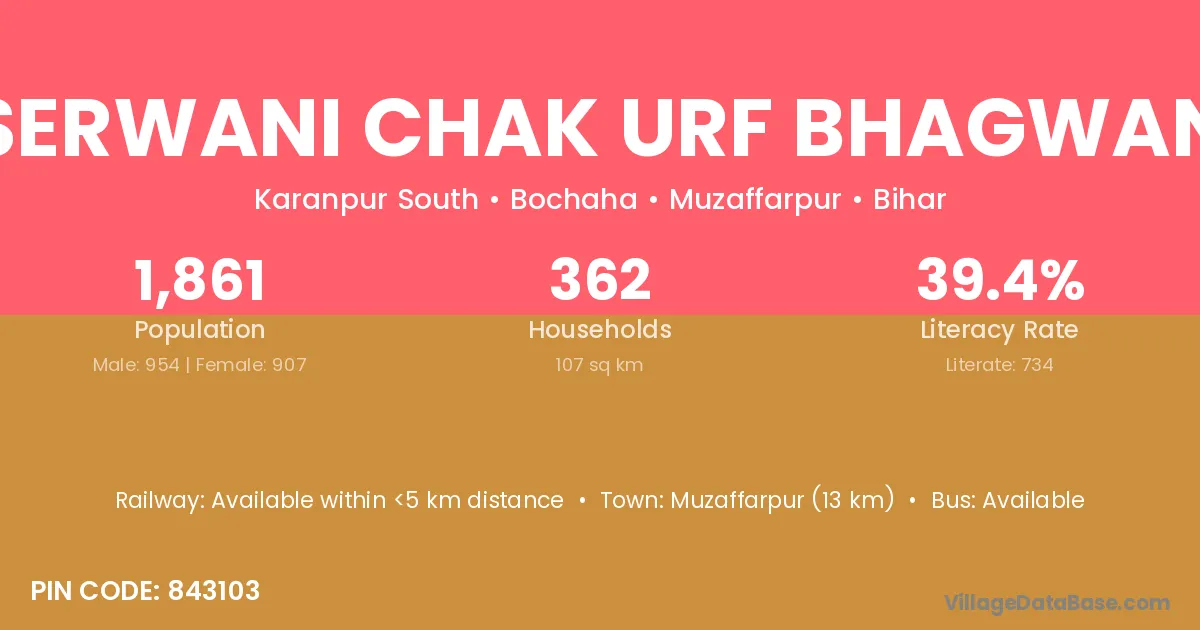 Serwani Chak Urf Bhagwan village has a total population of 1,861 people, of which 954 are males and 907 are females.
