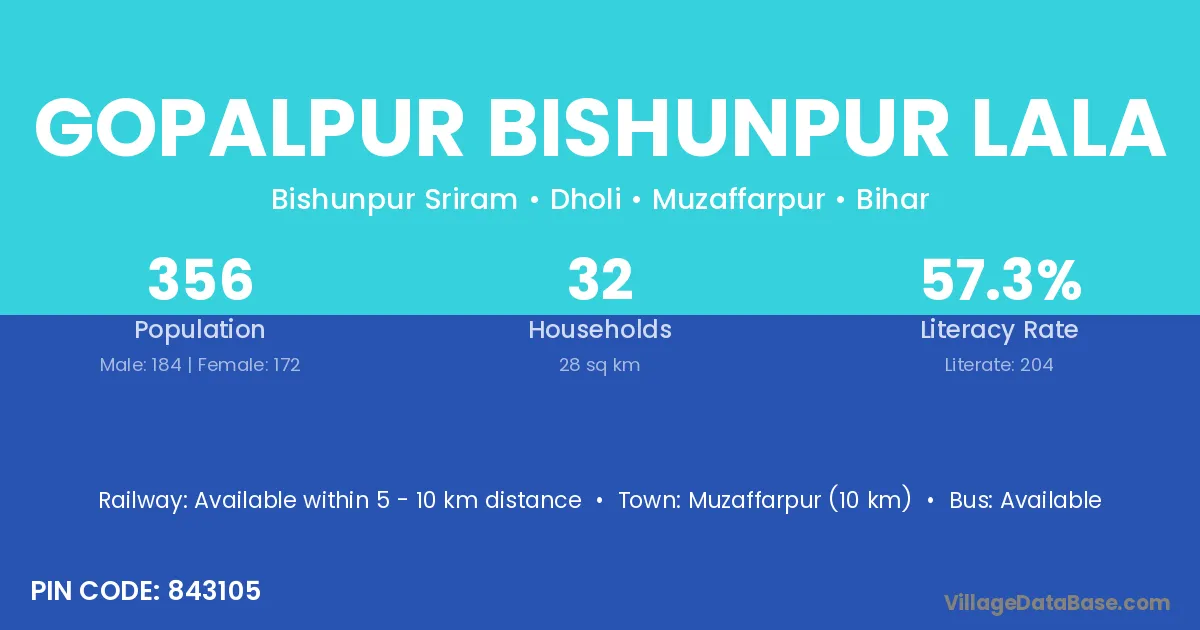 Gopalpur Bishunpur Lala village has a total population of 356 people, of which 184 are males and 172 are females.