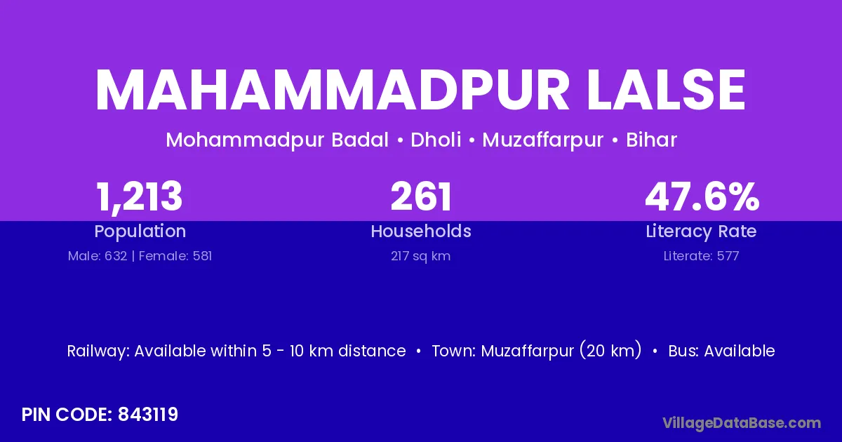 Muzaffarpur (20 km) is the nearest town to Mahammadpur Lalse village for major economic activities and is located approximately 20 km away.
