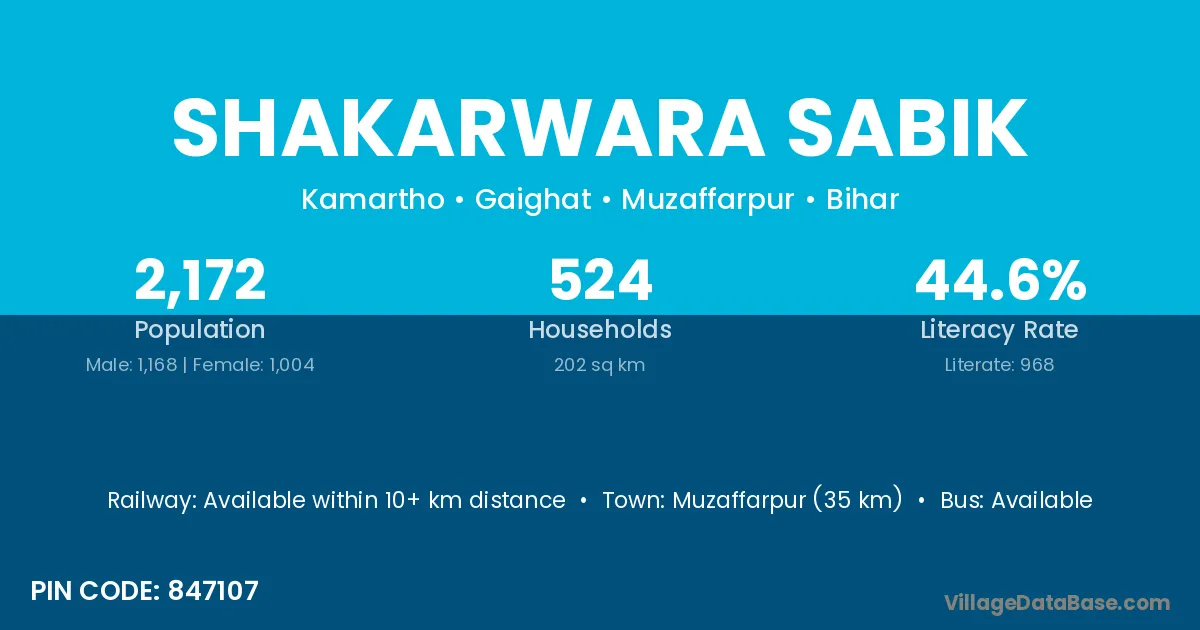 Muzaffarpur (35 km) is the nearest town to Shakarwara Sabik village for major economic activities and is located approximately 35 km away.
