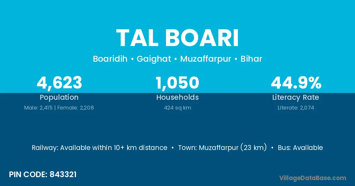 Muzaffarpur (23 km) is the nearest town to Tal Boari village for major economic activities and is located approximately 23 km away.