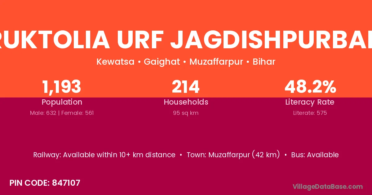 Muzaffarpur (42 km) is the nearest town to Taruktolia Urf Jagdishpurbarua village for major economic activities and is located approximately 42 km away.