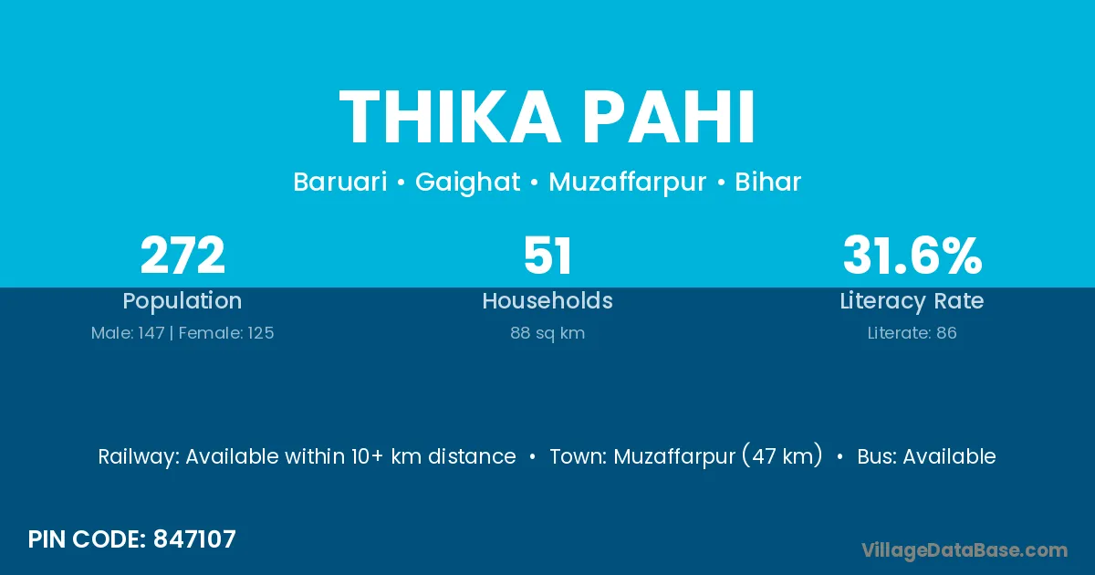Muzaffarpur (47 km) is the nearest town to Thika Pahi village for major economic activities and is located approximately 47 km away.