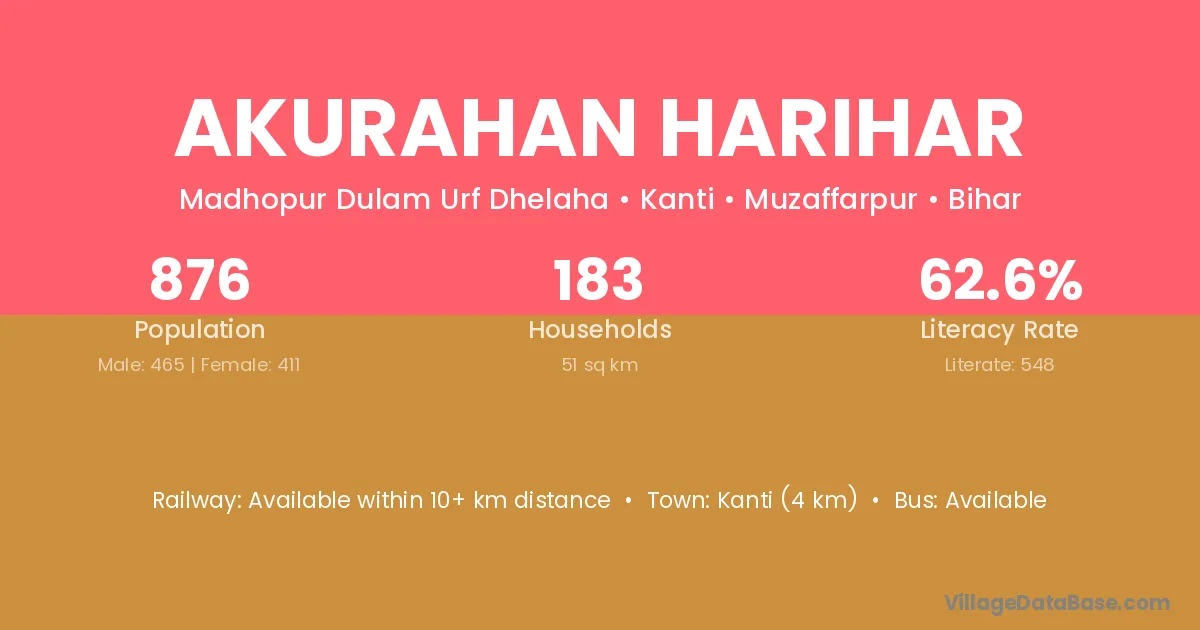 Kanti (4 km) is the nearest town to Akurahan Harihar village for major economic activities and is located approximately 4 km away.
