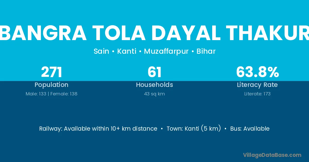 Bangra Tola Dayal Thakur village has a total population of 271 people, of which 133 are males and 138 are females.
