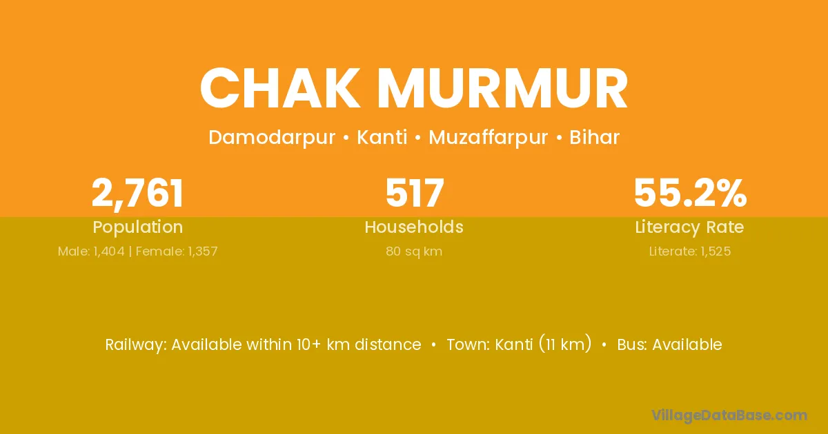 Kanti (11 km) is the nearest town to Chak Murmur village for major economic activities and is located approximately 11 km away.