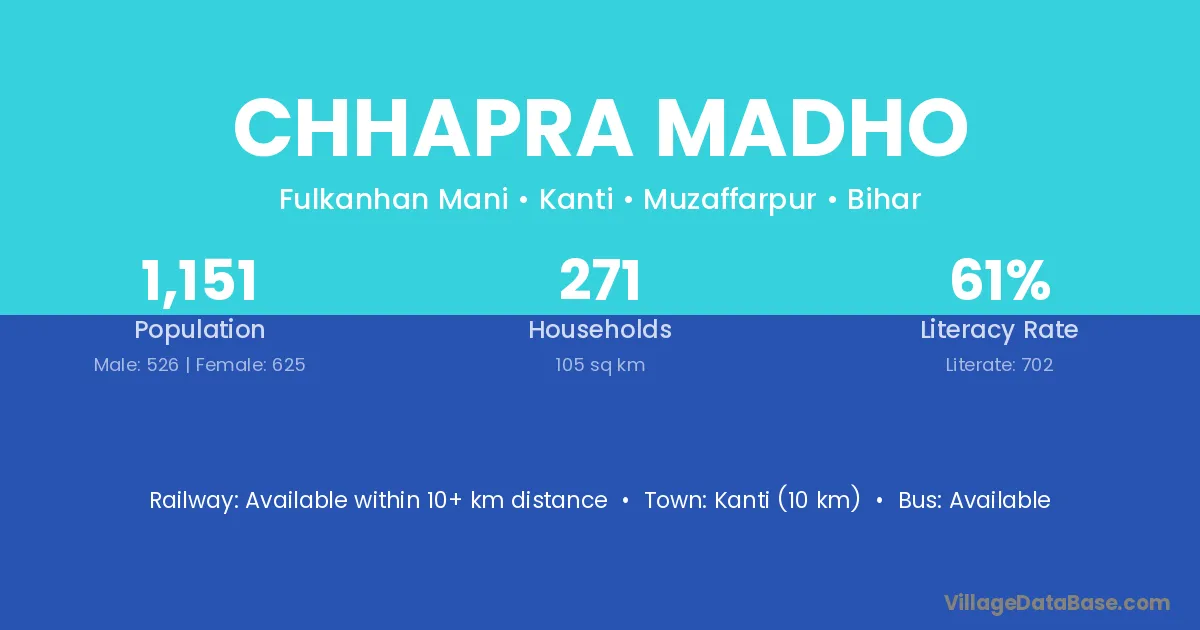 Kanti (10 km) is the nearest town to Chhapra Madho village for major economic activities and is located approximately 10 km away.