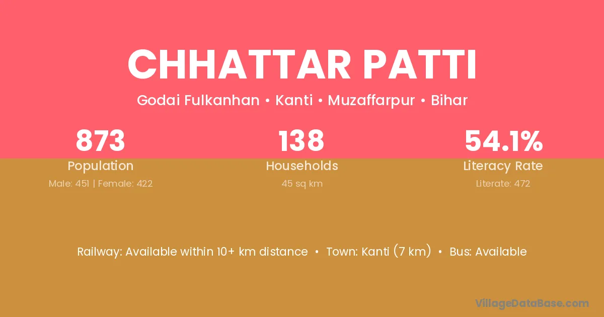 Kanti (7 km) is the nearest town to Chhattar Patti village for major economic activities and is located approximately 7 km away.