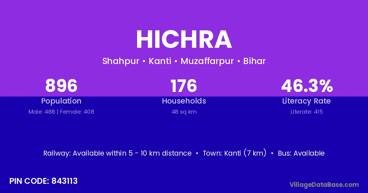 Kanti (7 km) is the nearest town to Hichra village for major economic activities and is located approximately 7 km away.