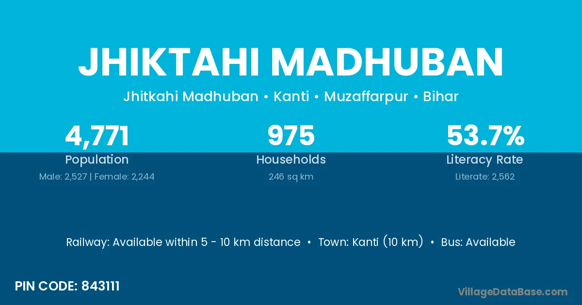 Kanti (10 km) is the nearest town to Jhiktahi Madhuban village for major economic activities and is located approximately 10 km away.