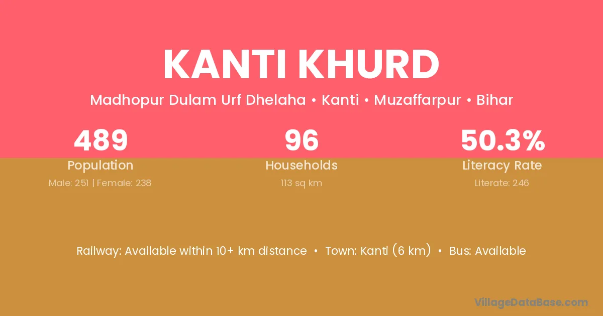 Kanti Khurd village has a total population of 489 people, of which 251 are males and 238 are females.