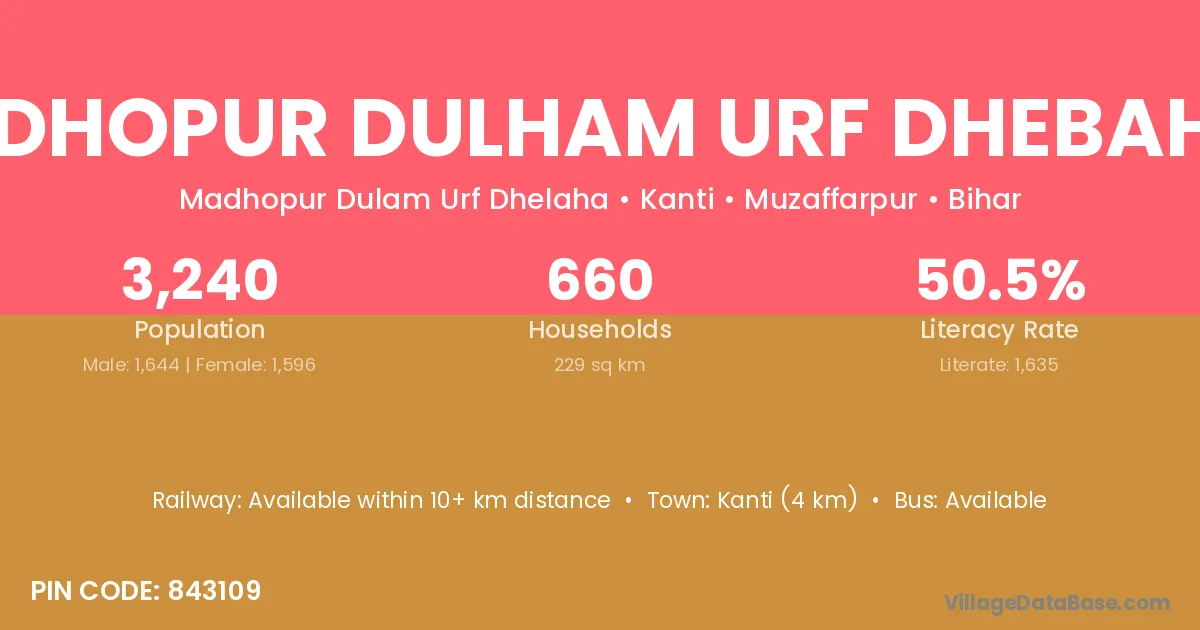 Kanti (4 km) is the nearest town to Madhopur Dulham Urf Dhebahan village for major economic activities and is located approximately 4 km away.