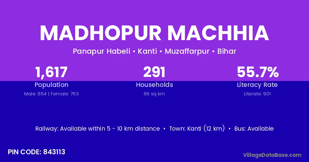 Kanti (12 km) is the nearest town to Madhopur Machhia village for major economic activities and is located approximately 12 km away.
