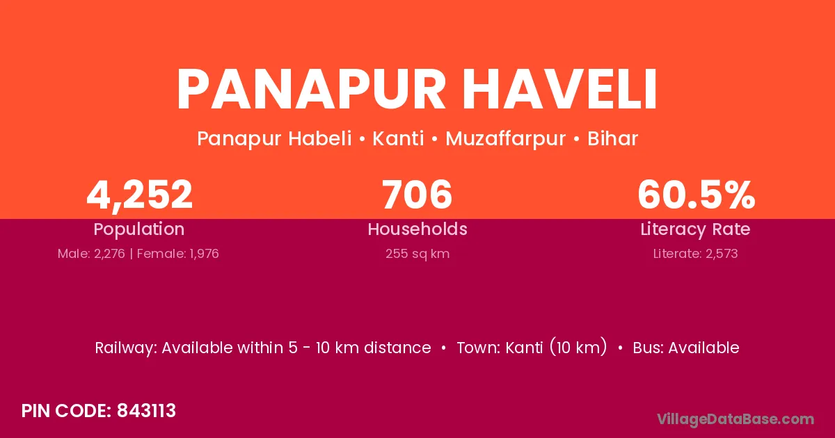 Kanti (10 km) is the nearest town to Panapur Haveli village for major economic activities and is located approximately 10 km away.