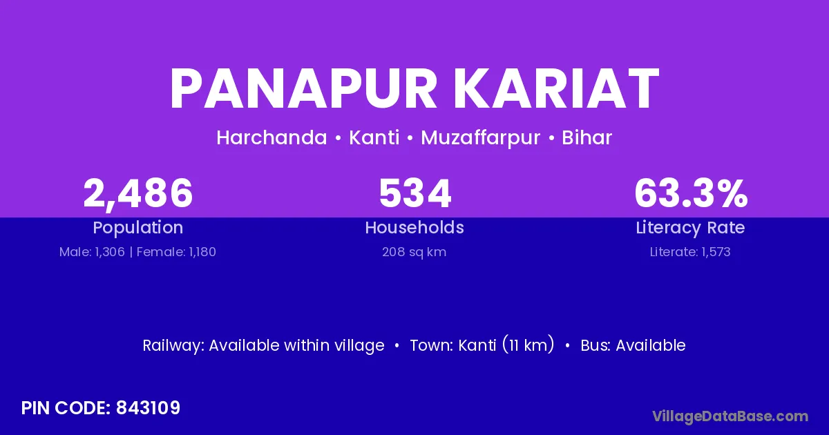 Kanti (11 km) is the nearest town to Panapur Kariat village for major economic activities and is located approximately 11 km away.