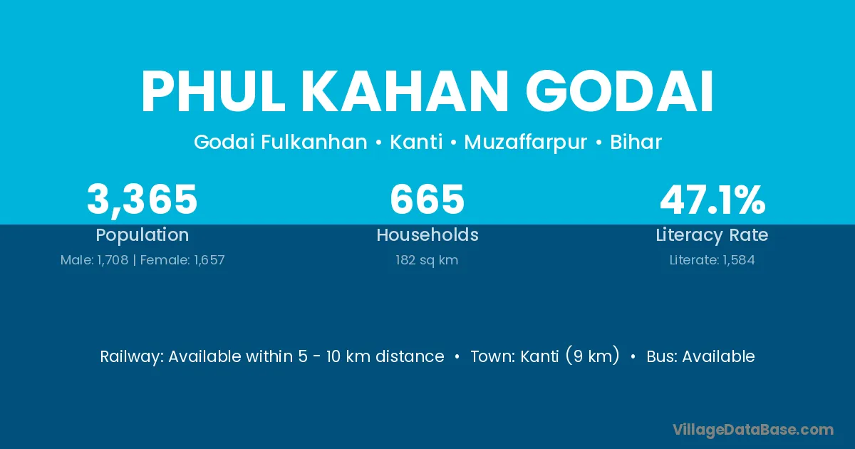 Kanti (9 km) is the nearest town to Phul Kahan Godai village for major economic activities and is located approximately 9 km away.