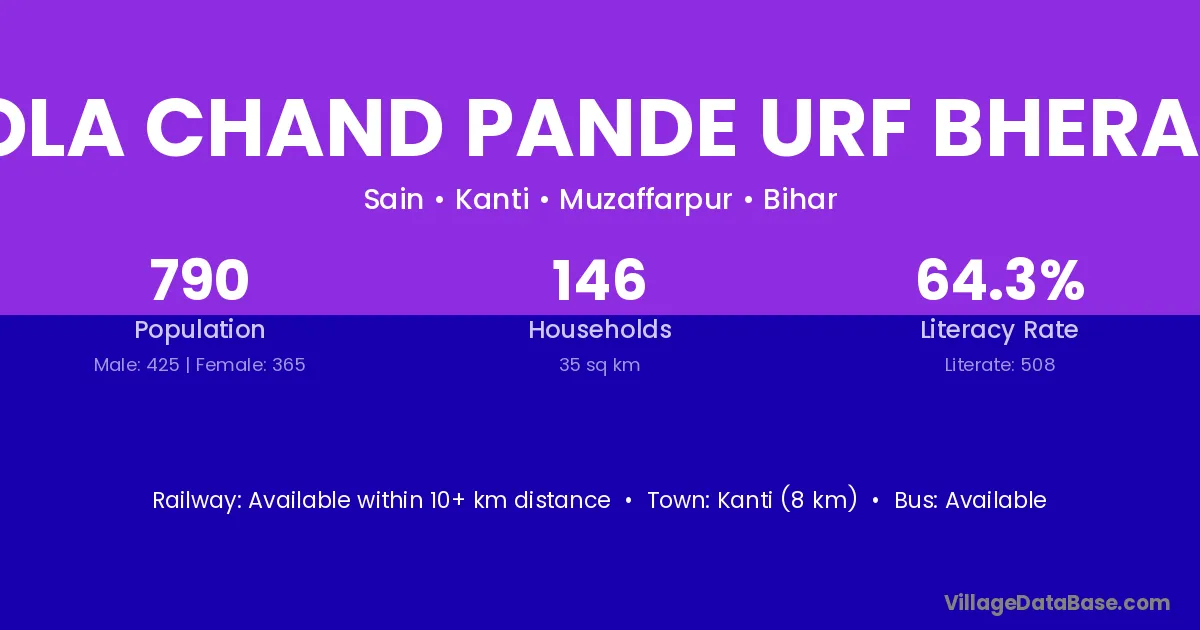 Kanti (8 km) is the nearest town to Tola Chand Pande Urf Bherahi village for major economic activities and is located approximately 8 km away.
