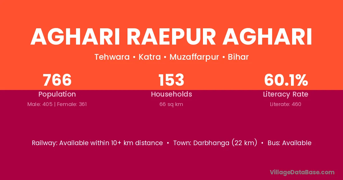 Darbhanga (22 km) is the nearest town to Aghari Raepur Aghari village for major economic activities and is located approximately 22 km away.