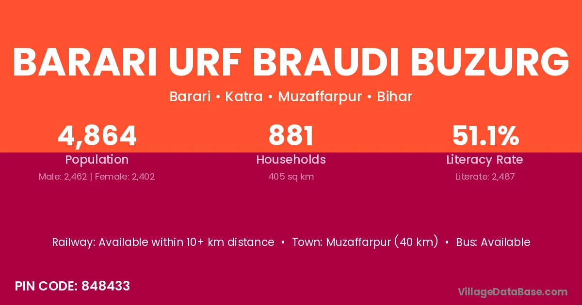 Barari Urf Braudi Buzurg village has a total population of 4,864 people, of which 2,462 are males and 2,402 are females.