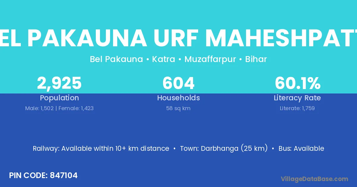 Darbhanga (25 km) is the nearest town to Bel Pakauna Urf Maheshpatti village for major economic activities and is located approximately 25 km away.