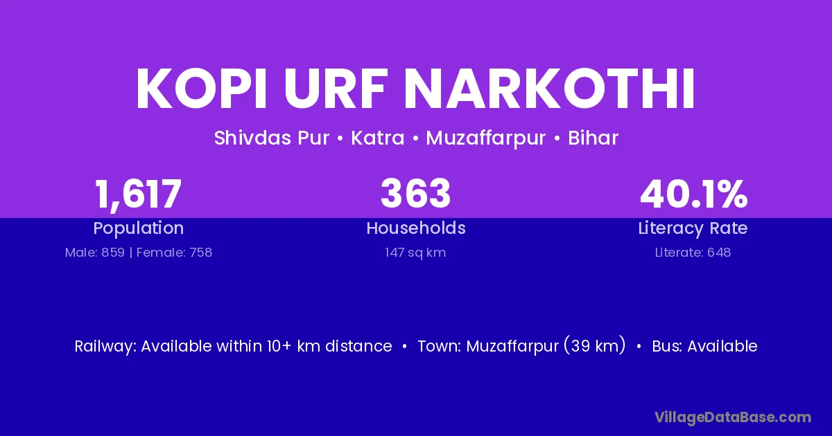 Muzaffarpur (39 km) is the nearest town to Kopi Urf Narkothi village for major economic activities and is located approximately 39 km away.