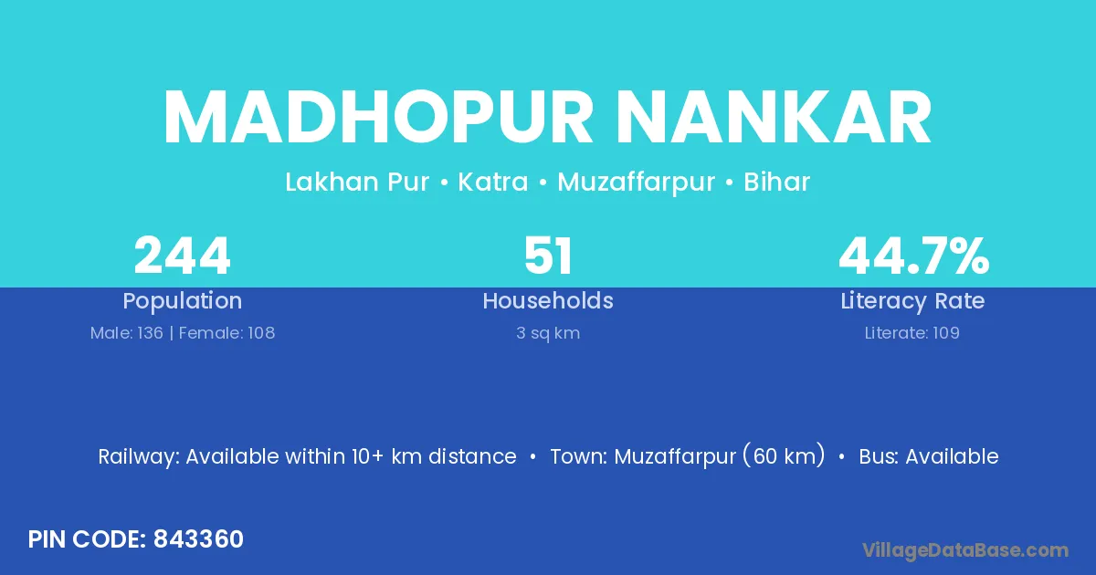 Muzaffarpur (60 km) is the nearest town to Madhopur Nankar village for major economic activities and is located approximately 60 km away.