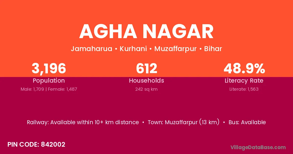 Muzaffarpur (13 km) is the nearest town to Agha Nagar village for major economic activities and is located approximately 13 km away.