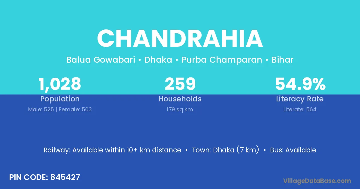 Muzaffarpur (18 km) is the nearest town to Chandrahia village for major economic activities and is located approximately 18 km away.